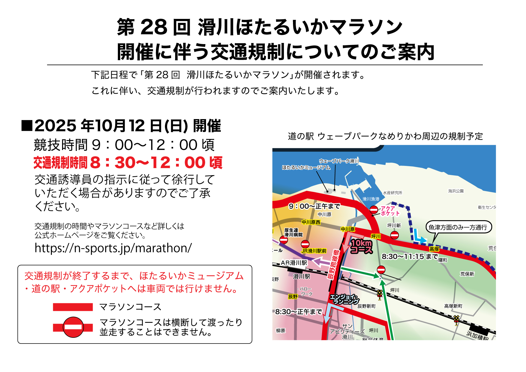 【道の駅ウェーブパークなめりかわ】『ホタルイカマラソン』開催に伴う交通規制について 道の駅「ウェーブパークなめりかわ」 2025年10月12日(日)8:30〜12:00 『ホタルイカマラソン』開催に伴い、道の駅 ウェーブパークなめりかわ周辺道路が交通規制されます。 詳しくはこちらから 2025年10月1日