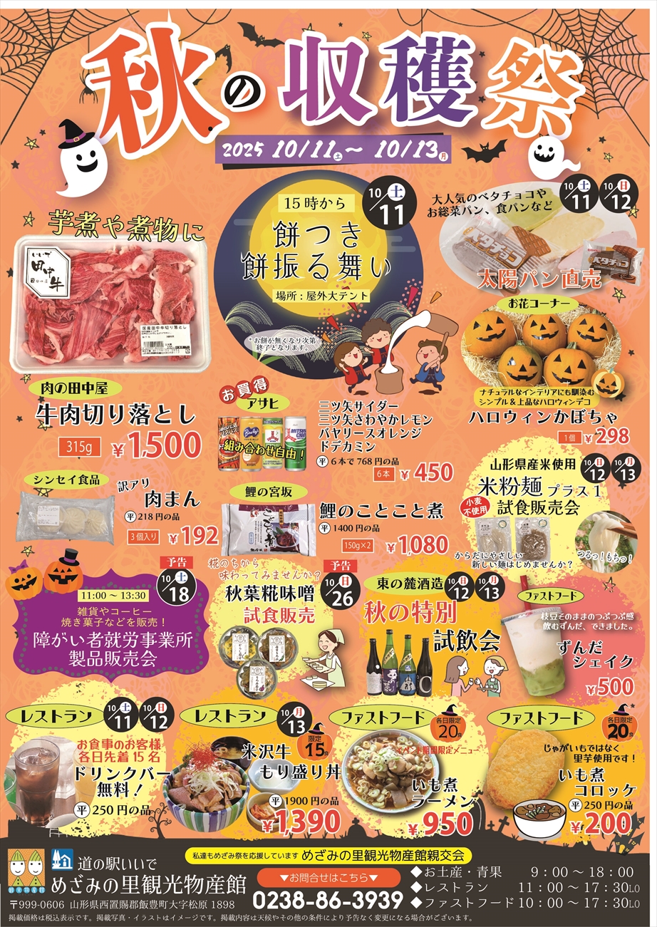 牛肉切り落としを始め、芋煮商品や、試飲会や試食会、おうちインテリアやお庭に人気のハロウィンカボチャ、南陽市のパン屋さん