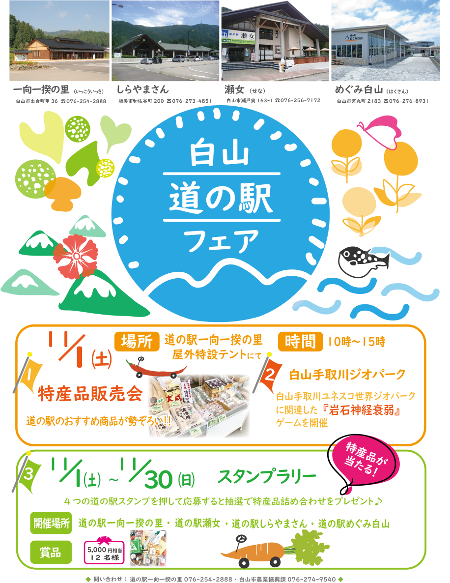 個性豊かな4つの道の駅「道の駅一向一揆の里」「道の駅しらやまさん」「道の駅瀬女」「道の駅めぐみ白山」が連携して行う道の駅フェア♬