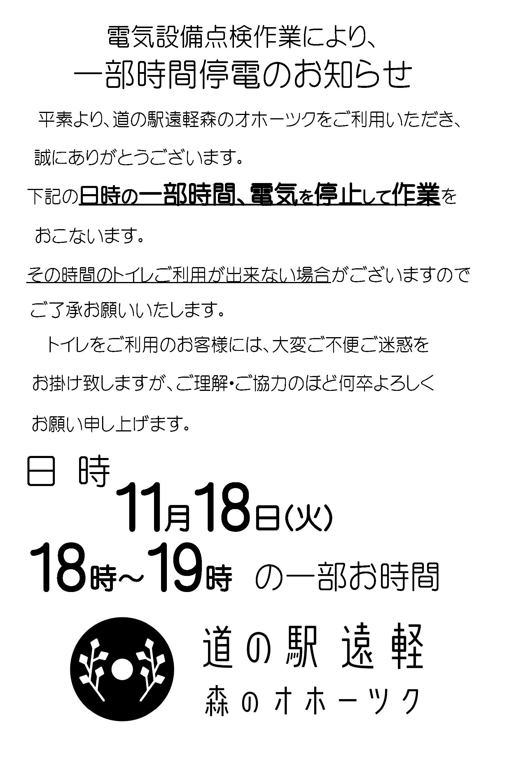 【道の駅遠軽森のオホーツク】11月18日電気設備点検のお知らせ