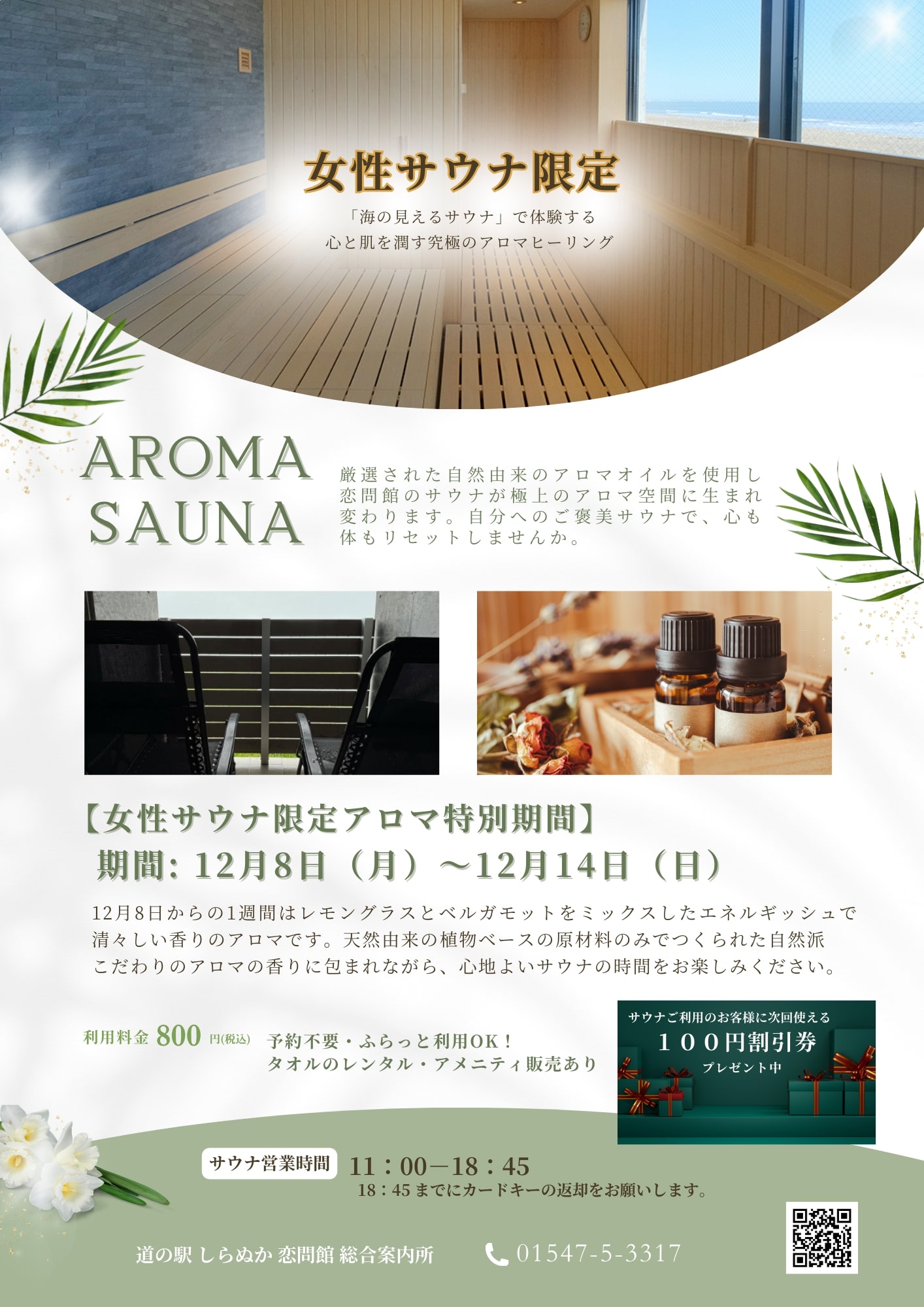 【道の駅しらぬか恋問館】女性サウナで期間限定・アロマの香りに包まれるサウナ体験 道の駅「しらぬか恋問館」 女性サウナ限定でアロマの香りに包まれながらサウナをお楽しみいただけます。 期間は12月8日~14日限定ですので、この機会にぜひお立ち寄りください! 2025年12月4日