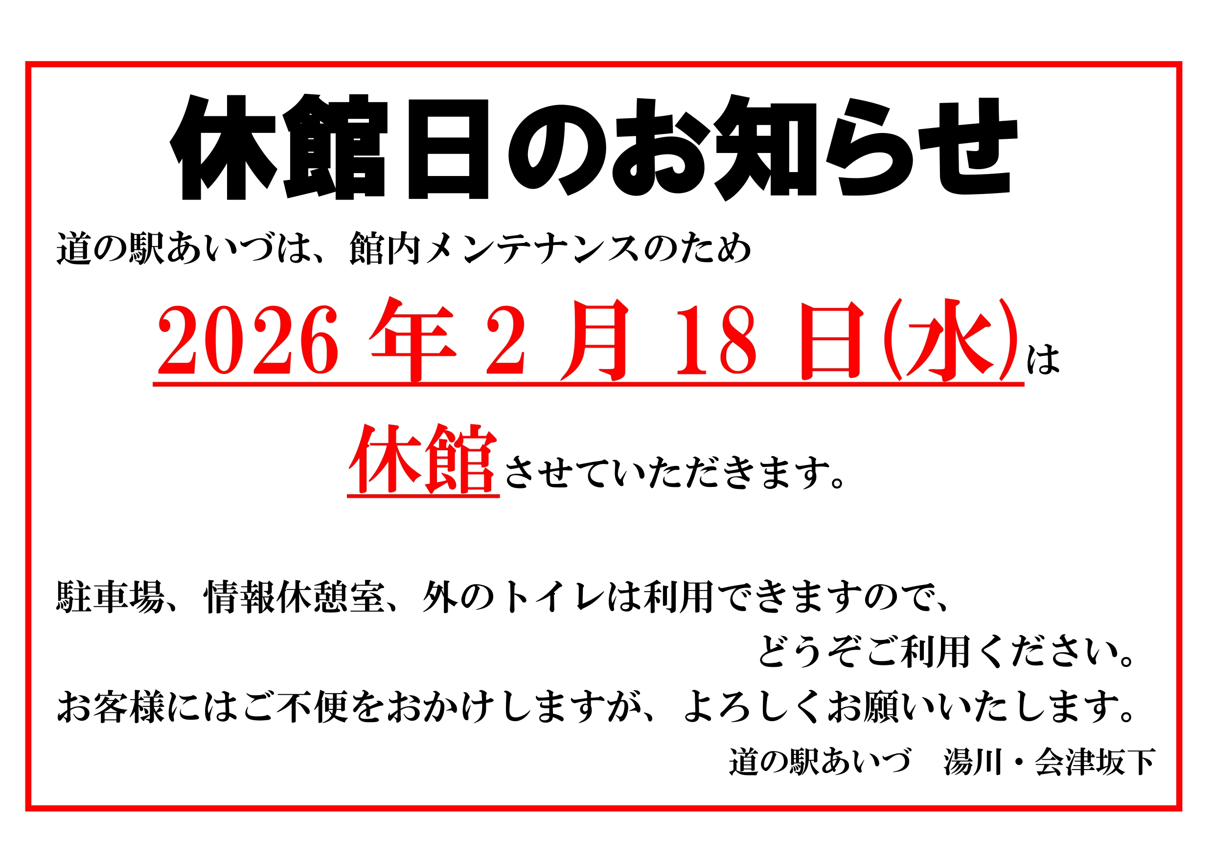 【道の駅あいづ 湯川・会津坂下】2月第三水曜日は定休日です。