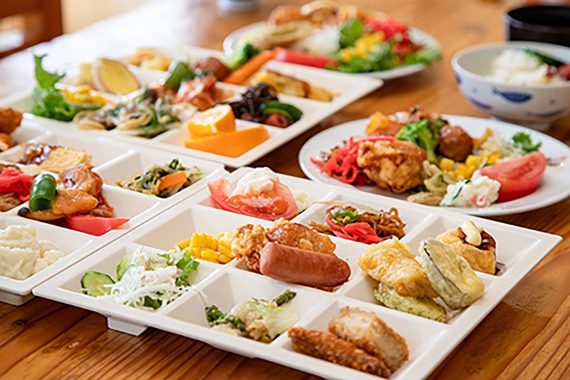 土日祝日限定ランチビュッフェ大人1,300円(中学生以上)、シルバー(65歳以上)1,100円、小学生650円、幼児(3歳)~小学生未満450円。開催時間11:00~15:00(14:00受付終了)。地元食材たっぷりの料理を提供しています。
