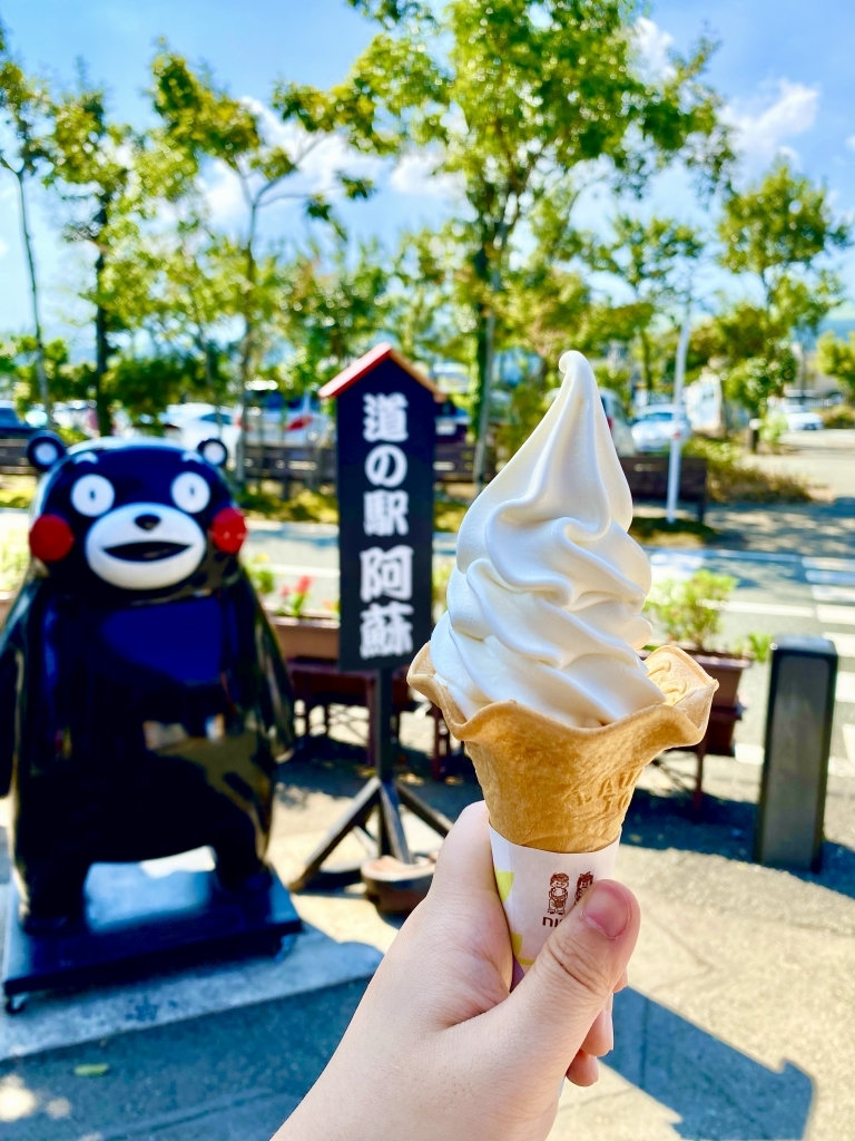 阿蘇五岳を正面に望め、その景観を生かし、駐車場は阿蘇に自生するコナラ等を植栽し四季を感じる演出を行っています。無料給水所や電気自動車充電設備、大型バイク専用駐車場があり、来館者が快適に観光を楽しんで頂けるよう努めています。JR阿蘇駅や主要観光地とつながるバス停留所もすぐそばにあります。
